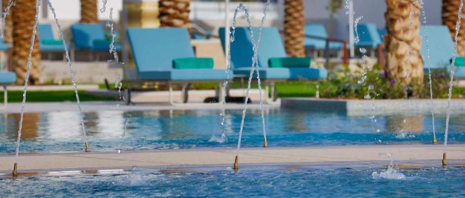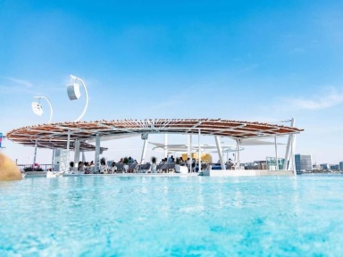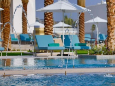 Территория компактная, но функциональная и ухоженная. Есть два открытых бассейна: один основной с пологим входом для детей и подогревом (работает даже зимой), второй — у ресторана Capilla с видом на яхтенную пристань и баром 360°. На территории также расположены детская зона с небольшим водным уголком, настольный теннис и зелёные зоны. До пляжа отеля — около 10 минут пешком; он песчаный, но купание в нём запрещено. Ближайший купальный пляж — Yas Beach, входит в инфраструктуру острова и требует отдельного входа (не входит в пакет отеля).