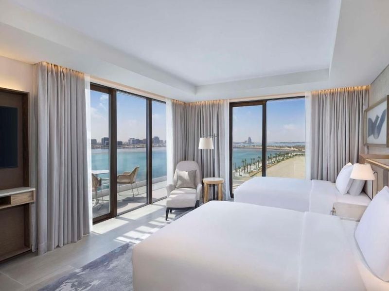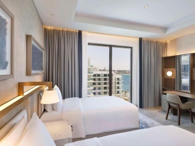 Two Double Beds Deluxe Room with Bay View & Yas Theme Park Access (~39 кв.м) – вид на залив. Состоит из спальни с двумя кроватями twin, ванной комнаты.