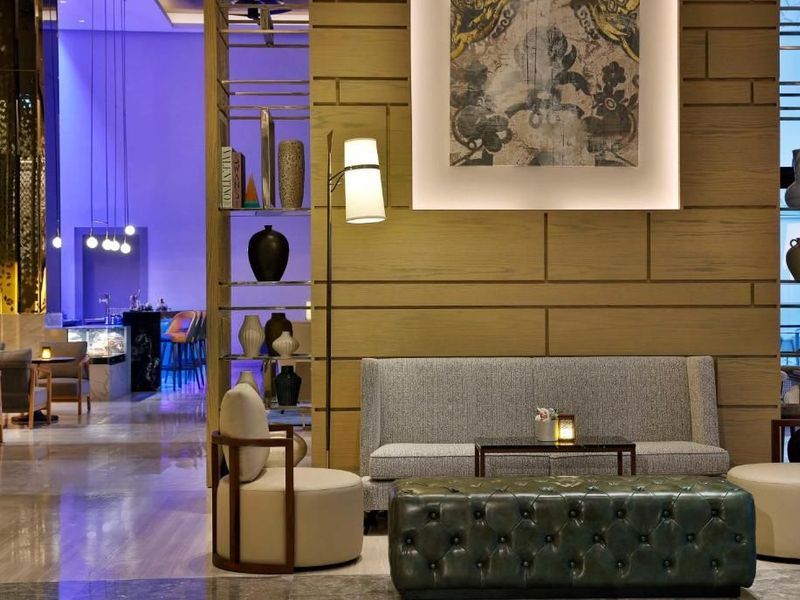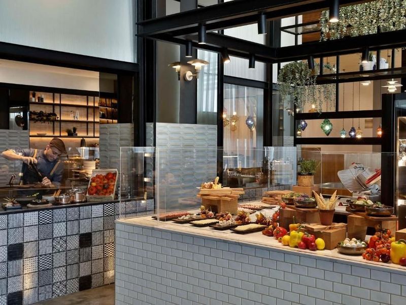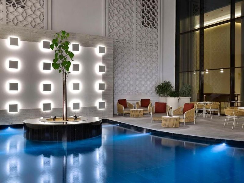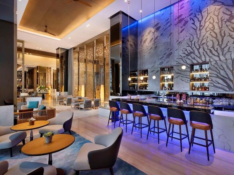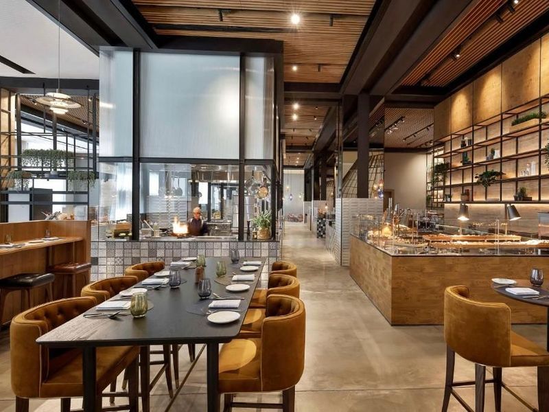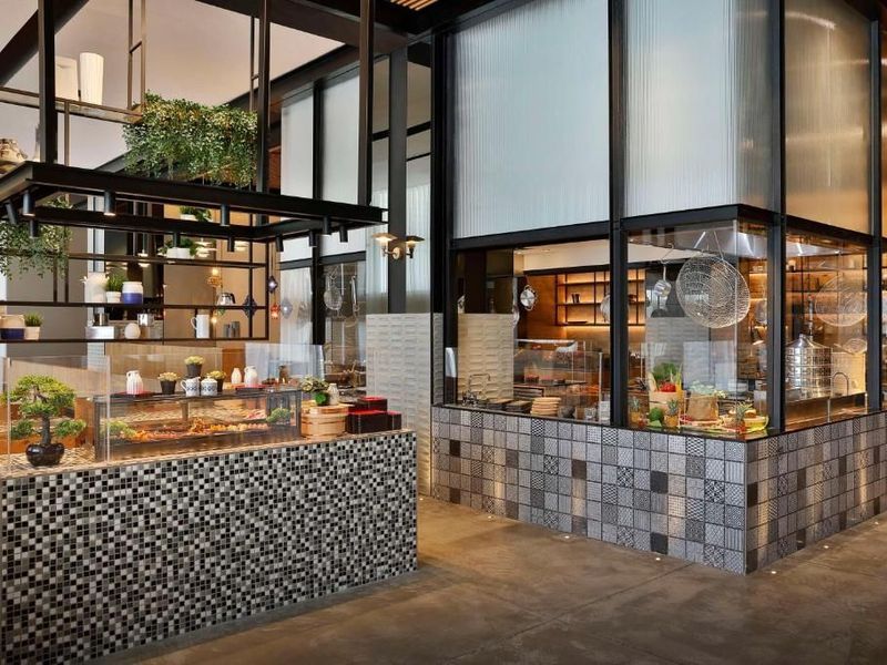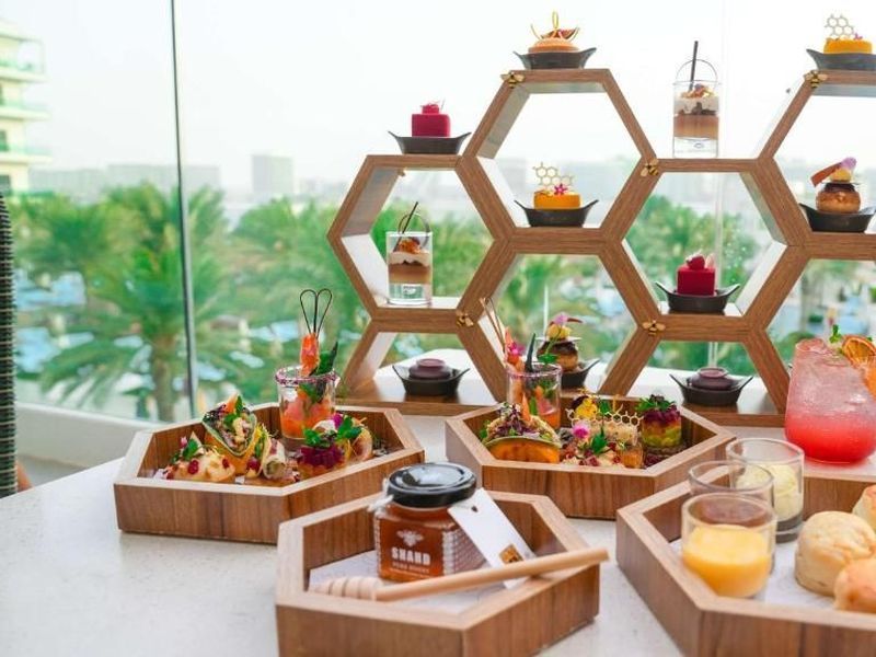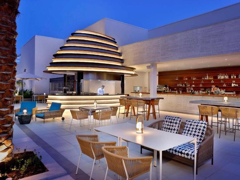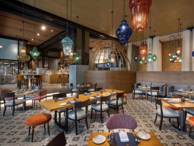 — Graphos Social Kitchen — основной ресторан с интернациональной кухней, шведским столом и отдельными станциями: японская (суши, роллы), индийская (карри, тандыри), итальянская (паста, пицца), гриль (рыба, креветки, устрицы), десертная зона с мороженым и выпечкой. Есть меню для вегетарианцев и специальные блюда по запросу (включая джайнскую кухню и безаллергенные варианты).